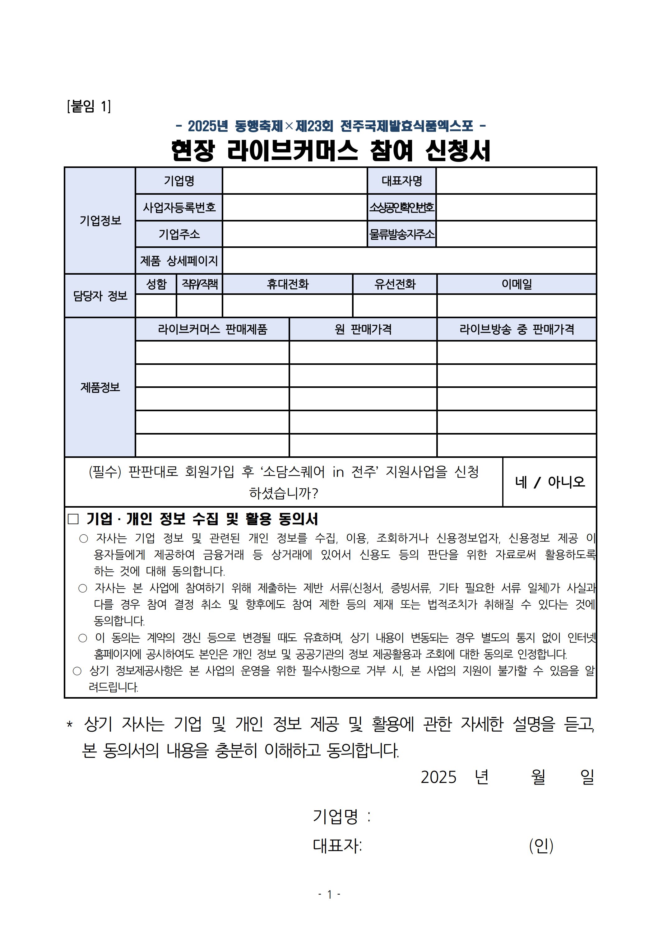 - [붙임2]_전주국제발효식품엑스포_라이브커머스_신청서.hwp (2.7M) 8회 다운로드 | DATE : 2025-10-23 09:32:39