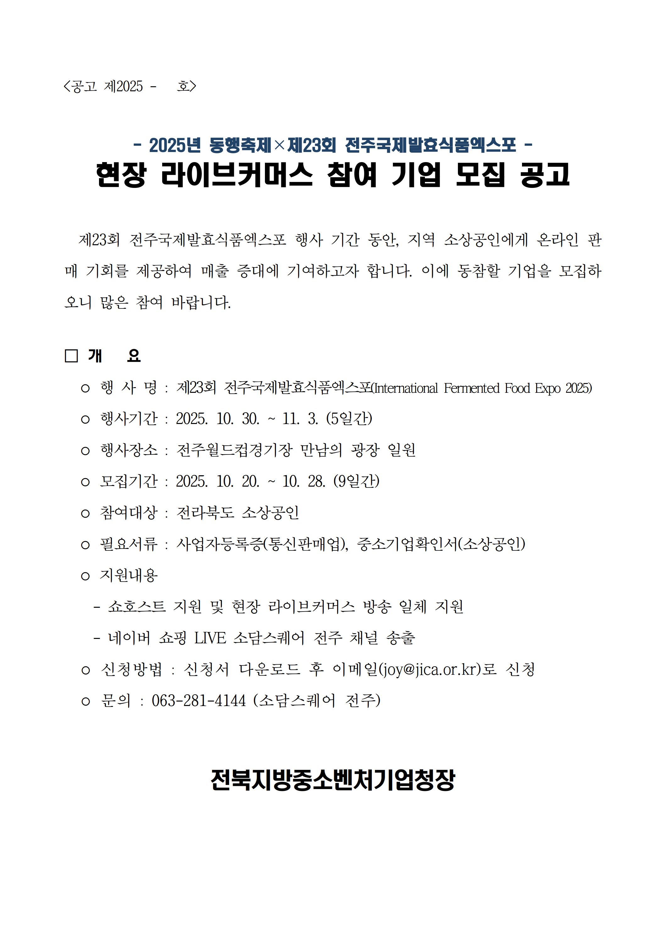 - [붙임1]_제23회전주국제발효식품엑스포_라이브커머스_공고문.hwp (49.5K) 8회 다운로드 | DATE : 2025-10-23 09:32:39