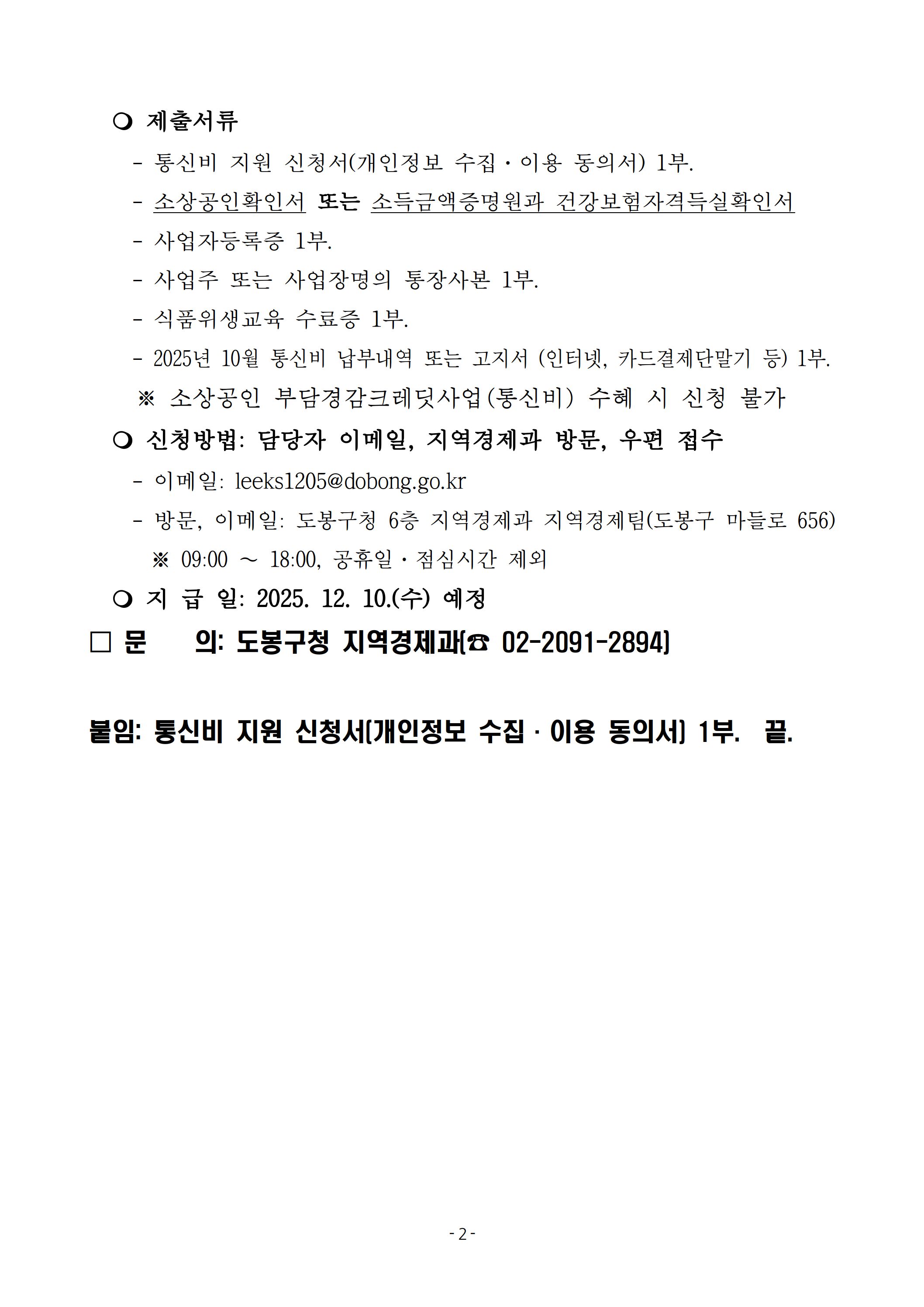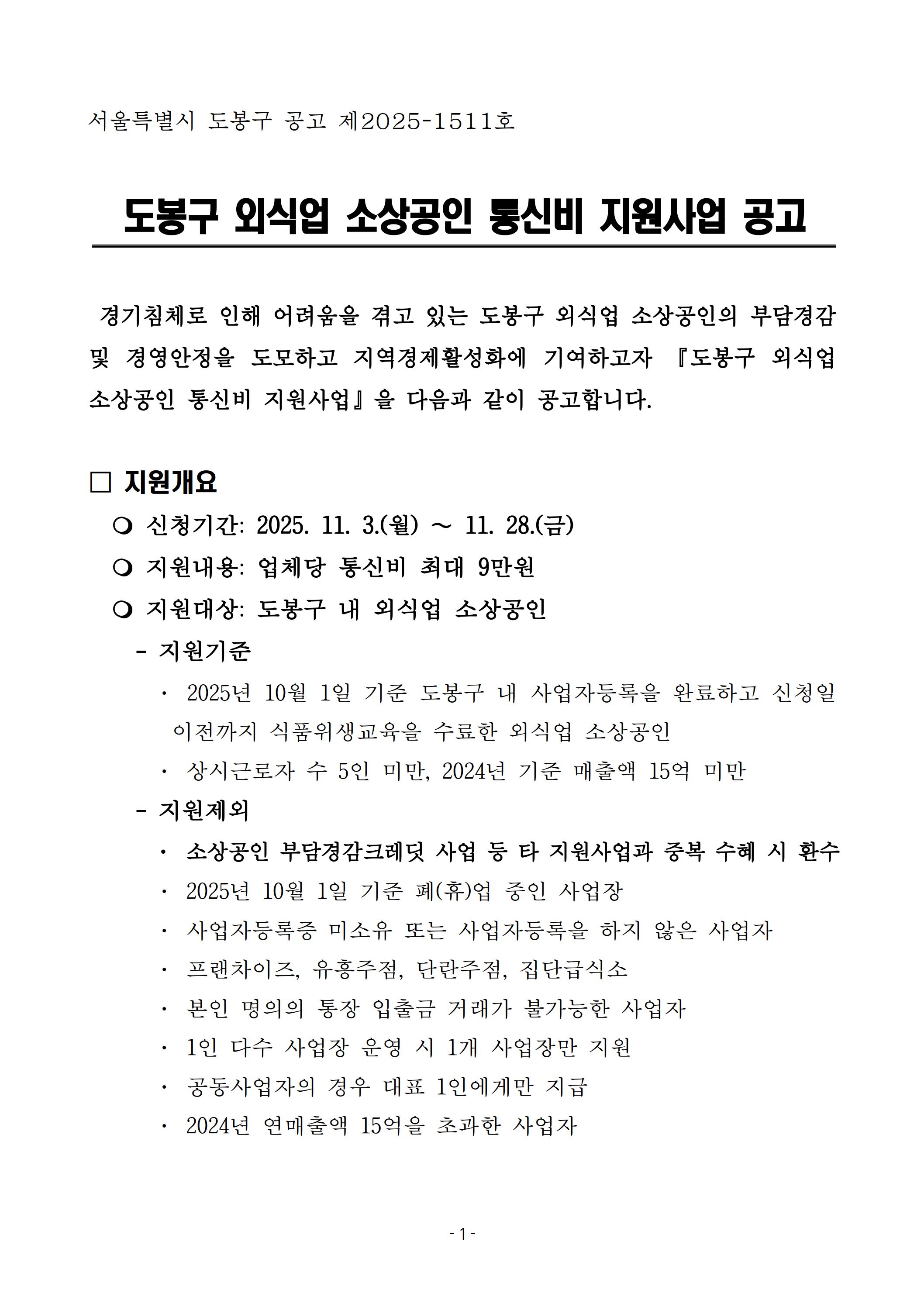 - 도봉구 외식업 소상공인 통신비 지원사업 공고문.hwp (64.0K) 5회 다운로드 | DATE : 2025-11-06 10:20:40