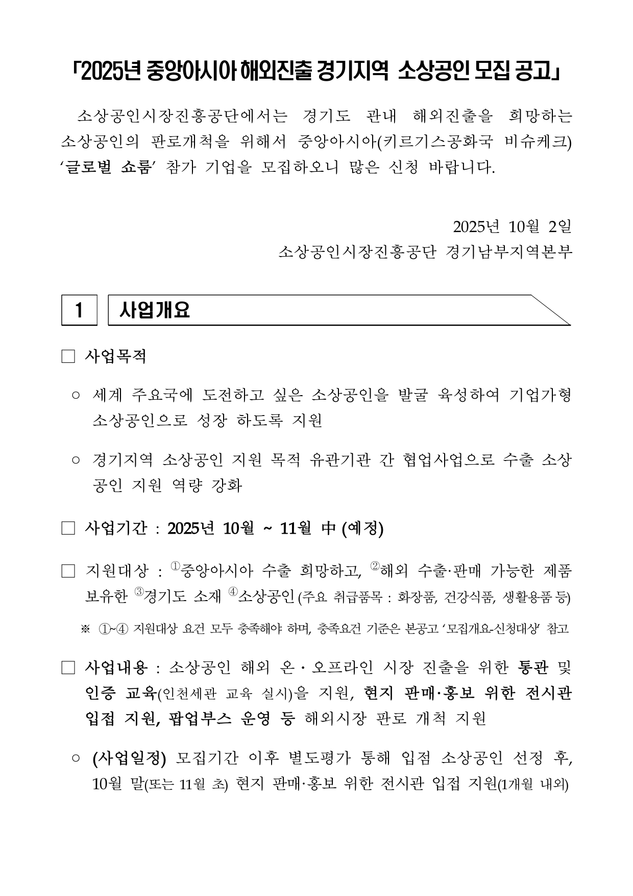 - 2025년 중앙아시아 해외진출 경기지역 소상공인 모집 공고.pdf (490.8K) 6회 다운로드 | DATE : 2025-10-14 07:23:15
